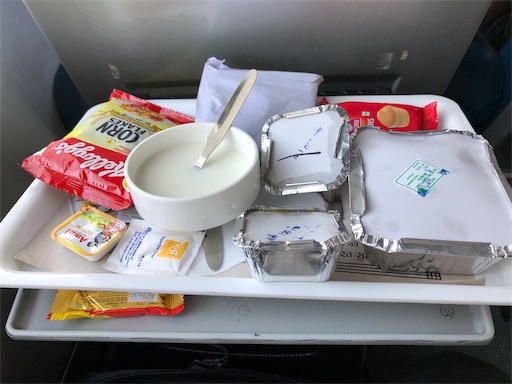 上記はすべて配られた後なんですが、まずKellogg'sのコンフレーク袋と鉢を受け取ります。その後、怪しいインドのおっさんがポットを持ってきて、この鉢に白い液体注ぎ込みます。熱いです。おそるおそる飲むと、なんとホットでうっすいミルクでした。このミルクにコーンフレークをぶち込めってことなんですね。Noですよ。しかし、このミルクを放置すると、電車の激しい揺れで、波が発生し、激しくこぼれ、ズボンにかかります。はい、かかりました。なので、さっさと飲むのがベストなんです。